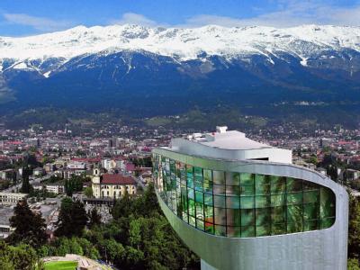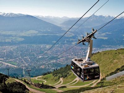 Ein Schrägaufzug bringt Besucher vom Auslauf hoch zur Schanze. Oben gibt es ein Café und eine Aussichtsplattform - jeweils mit Blick über Innsbruck und auf die Berge der Nordkette. Dort drüben, auf der Nordseite des Inntals, liegt die Seegrube, auf die eine Seilbahn führt. Nur rund 25 Minuten dauert die Fahrt vom Zentrum aus, einmal Umsteigen inklusive. Der erste Abschnitt der Nordkettenbahn führt bis auf 860 Meter Höhe. Er wurde komplett neu gebaut und ist erst seit Ende 2007 in Betrieb. In den vier Stationen dieses Abschnitts kommen die Bahnen unter Hauben aus mattem, gebogenem Glas zum Stehen.